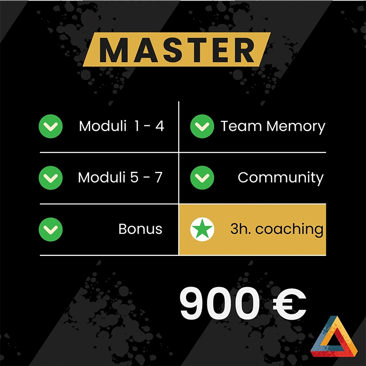 - Con la versione Master avrai a disposizione un’ora di consulenza uno a uno con ciascuno dei docenti, per un totale di tre ore di formazione diretta riservata